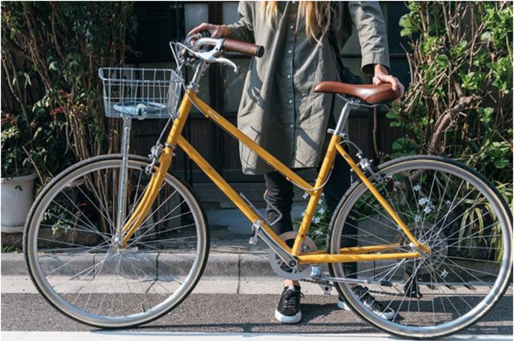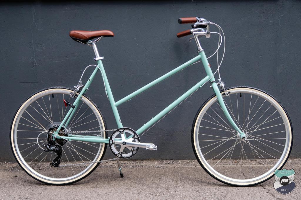 - Details: Upright handlebars with brown grips and brown saddle