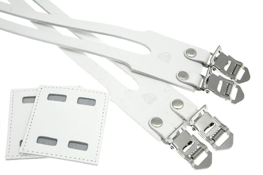 Double leather toe straps for double gate toe clips. Supplied with a special leather binding patch, which enables double straps to keep their shape whilst securing a stronger hold on the foot.