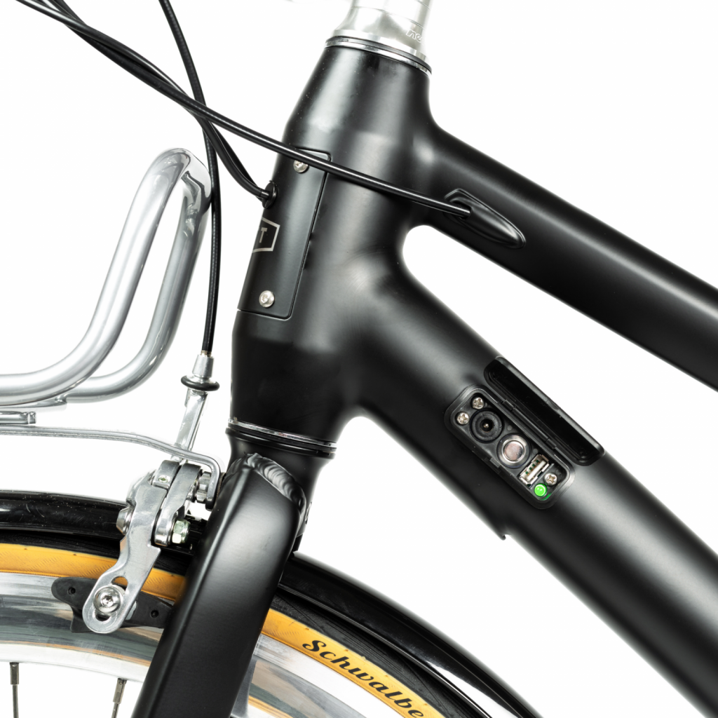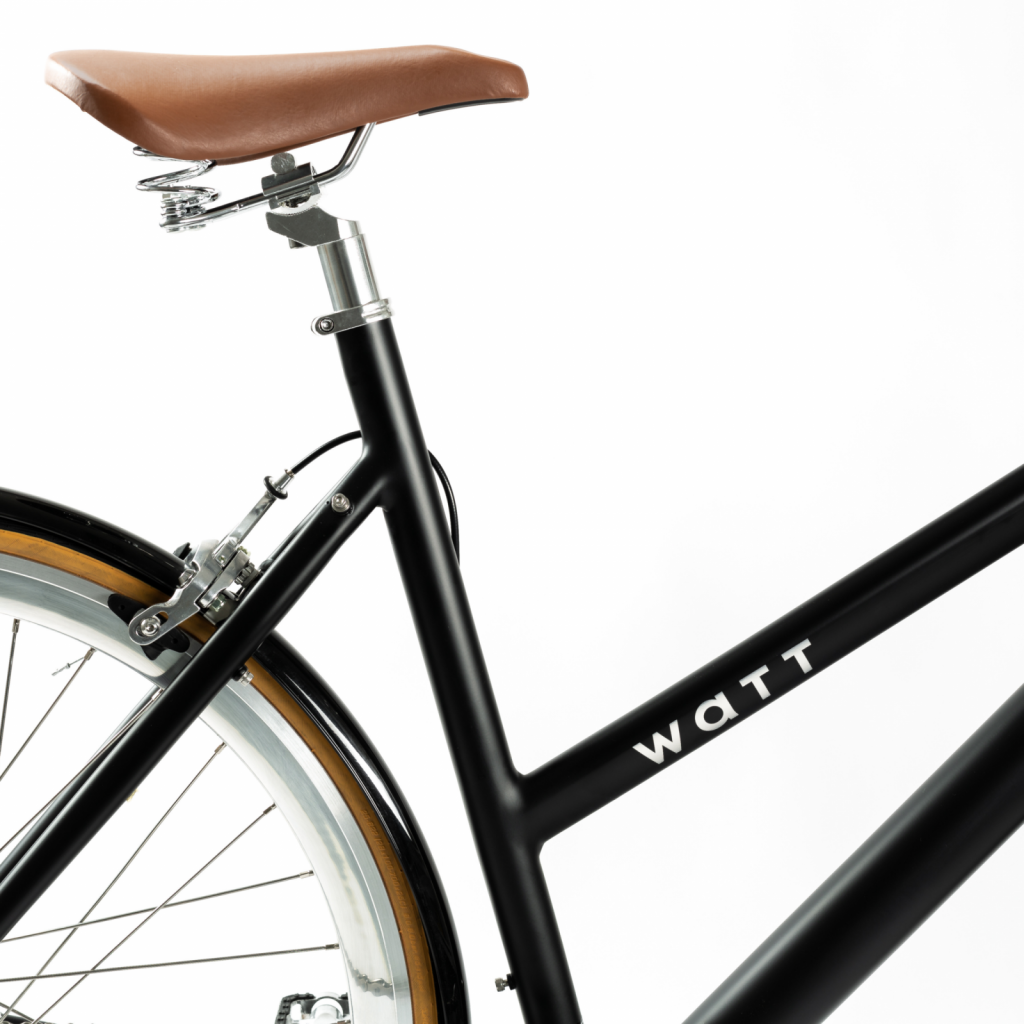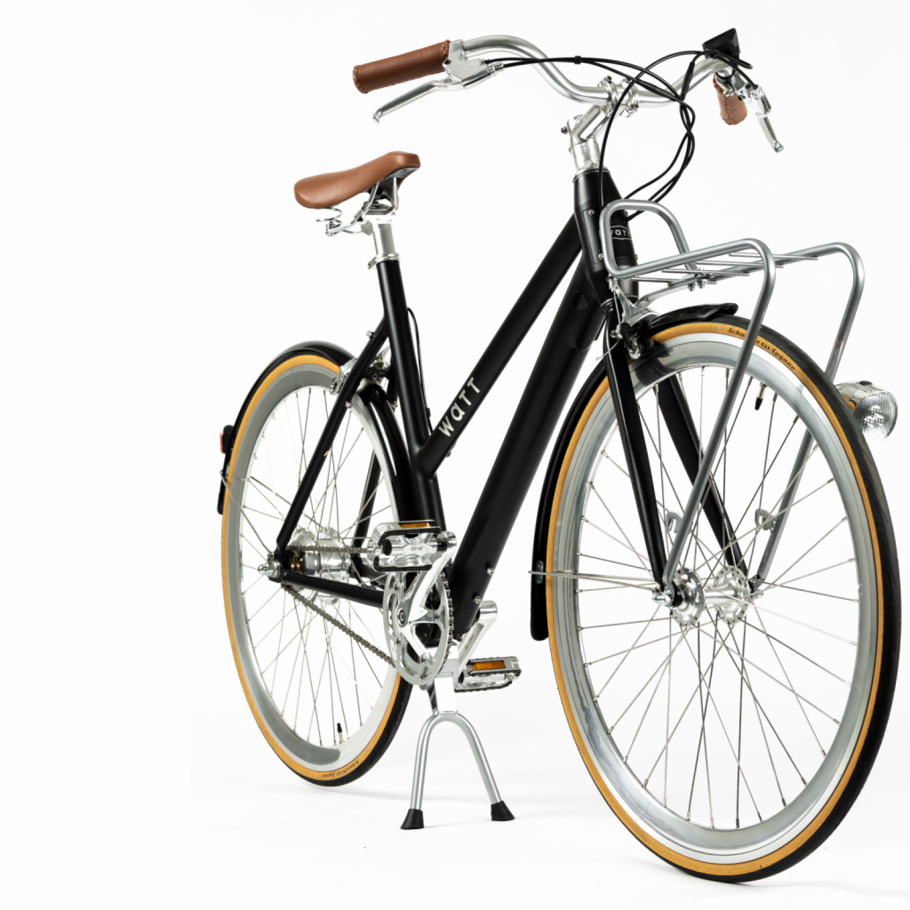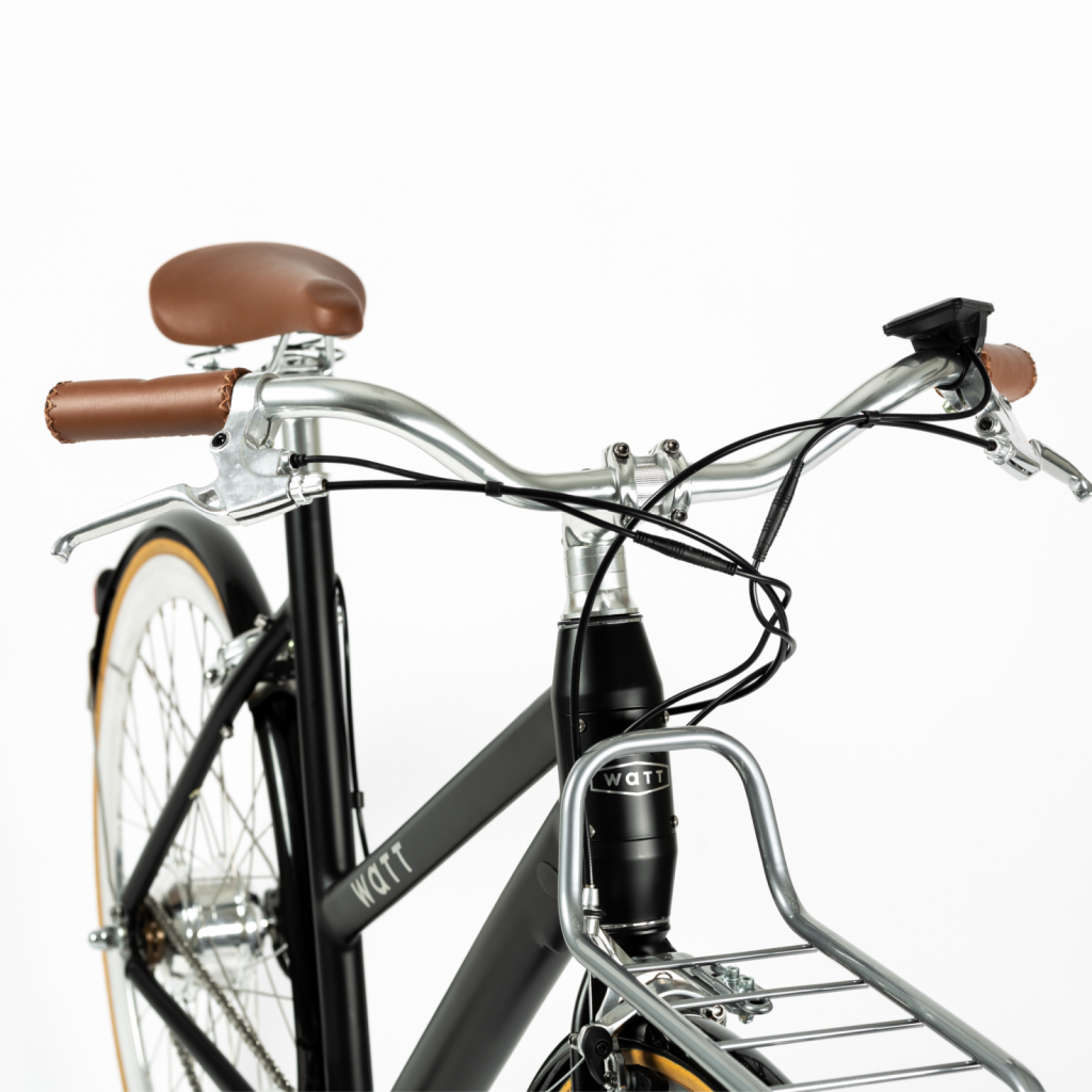 The basic edition of the ELECTRIC FEMALE is provided with: a brown saddle and brown grips, front rack with headlight, double kickstand, rear light and charger.