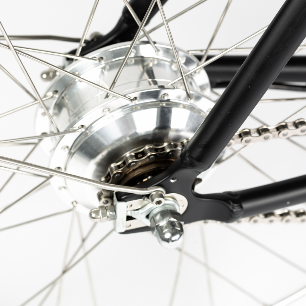 The basic edition of the ELECTRIC MALE is provided with: a brown saddle and brown grips, double kickstand, rear light and charger.